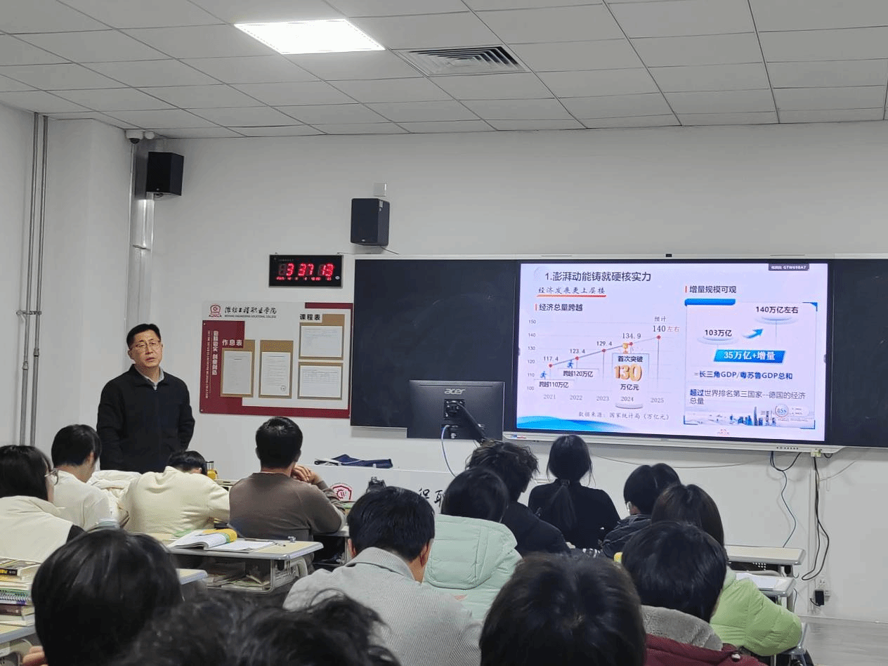 院长王忠山以《收官“十四五” 奋进“十五五” 在大国崛起中找准青春坐标》为题,分别为2024级物联网应用技术、2024级数控技术(3+2专本贯通班)学生讲授了一堂别开生面的思政大课。课堂上,王忠山聚焦“十四五”成就与“十五五”蓝图,以详实数据、生动案例和国际比较,深入阐释了我国在科技自立自强、构建新发展格局、推动共同富裕等方面的重大进展。结合山东省“绿色低碳高质量发展先行区”和潍坊市“更好潍坊”建设实践,紧密联系学院专业特色与学生发展,引导学生认识所学专业在服务国家战略、助力区域发展中的重要作用。他强调,新时代青年生逢其时、重任在肩,既是时代的见证者,更是中国式现代化的建设者。勉励同学们胸怀“国之大者”,将个人理想融入国家发展,锤炼本领、砥砺品格,努力成长为担当民族复兴大任的时代新人。王忠山的授课高屋建瓴、深入浅出,引发了同学们的广泛共鸣和深入讨论。