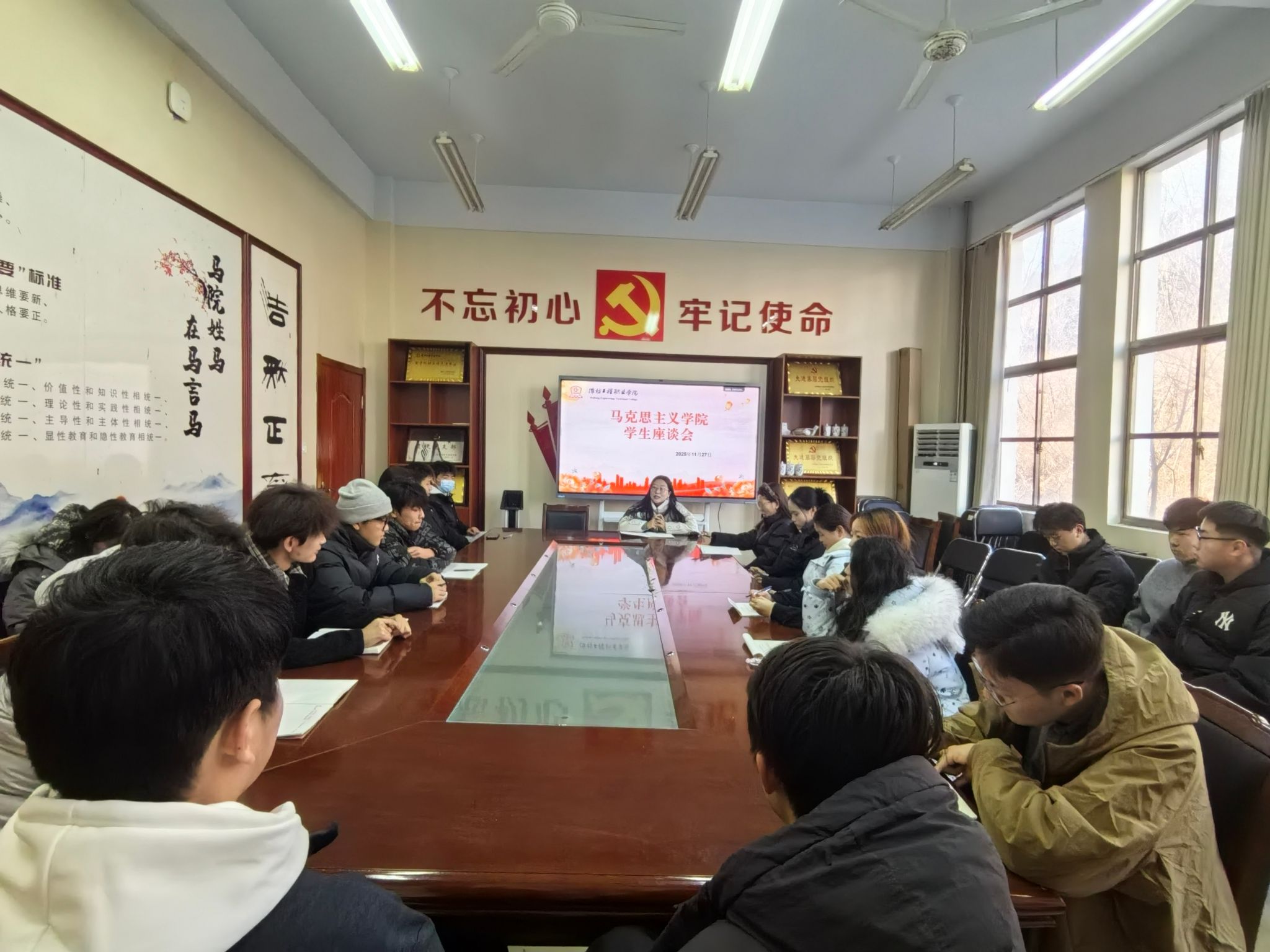 为切实做好本学期期中教学自查工作,准确掌握思政课教学情况。11月27日,马克思主义学院召开学生座谈会,邀请了各二级学院学生代表参加座谈。同学们踊跃发表意见,“有的老师总是在讲台上,希望老师多走下讲台转一转”、“同学们都觉得这是水课,不重视”、“希望老师能在教学中多增加有趣的互动环节”等等。也有的同学给自己的授课老师“点赞”,各种生动活泼的互动方式大大提高了思政课的吸引力。学院明确后续将从优化教学互动、强化课程价值引导、丰富课堂形式三方面改进,切实提升思政课教学质量。